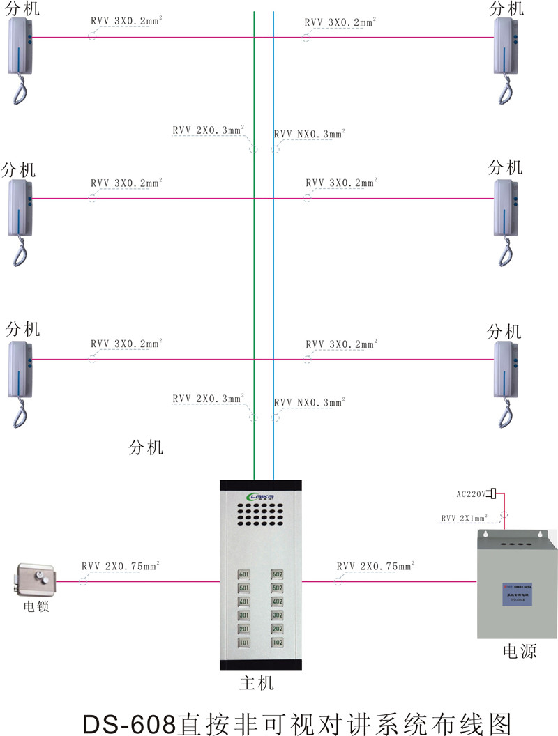 • DS-608A直按非可視對講系統布線圖